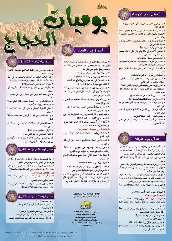 بوستر يحتوي على ملخص لما ينبغي للحاج أن يفعله خلال أيام الحج كلٌّ حَسَبَ نُسُكه.